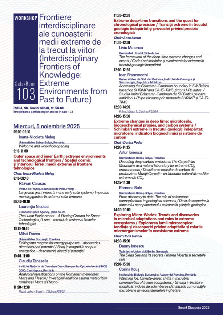 „Frontiere interdisciplinare ale cunoașterii: medii extreme de la trecut la viitor” este un eveniment dedicat promovării cercetării științifice interdisciplinare și consolidării colaborării dintre cercetători din România și diaspora. Tema centrală vizează explorarea mediilor extreme, naturale sau antropice, și înțelegerea dinamicii acestora de-a lungul timpului, de la trecutul îndepărtat până la provocările prezentului și direcțiile viitoare.